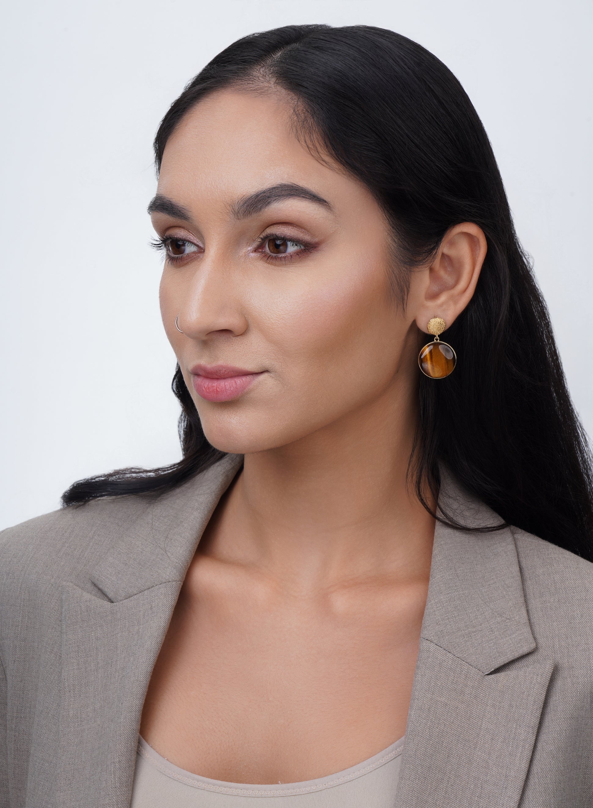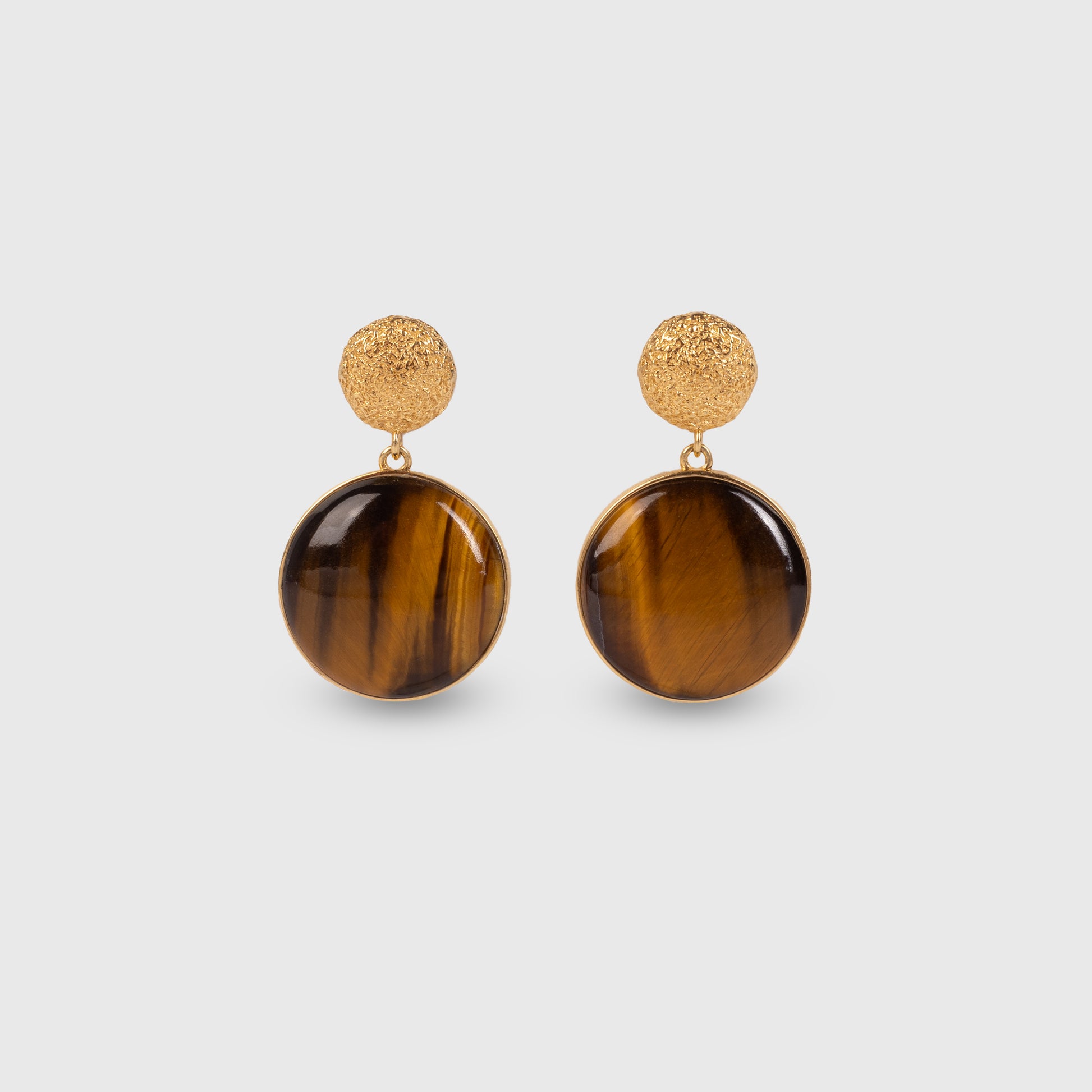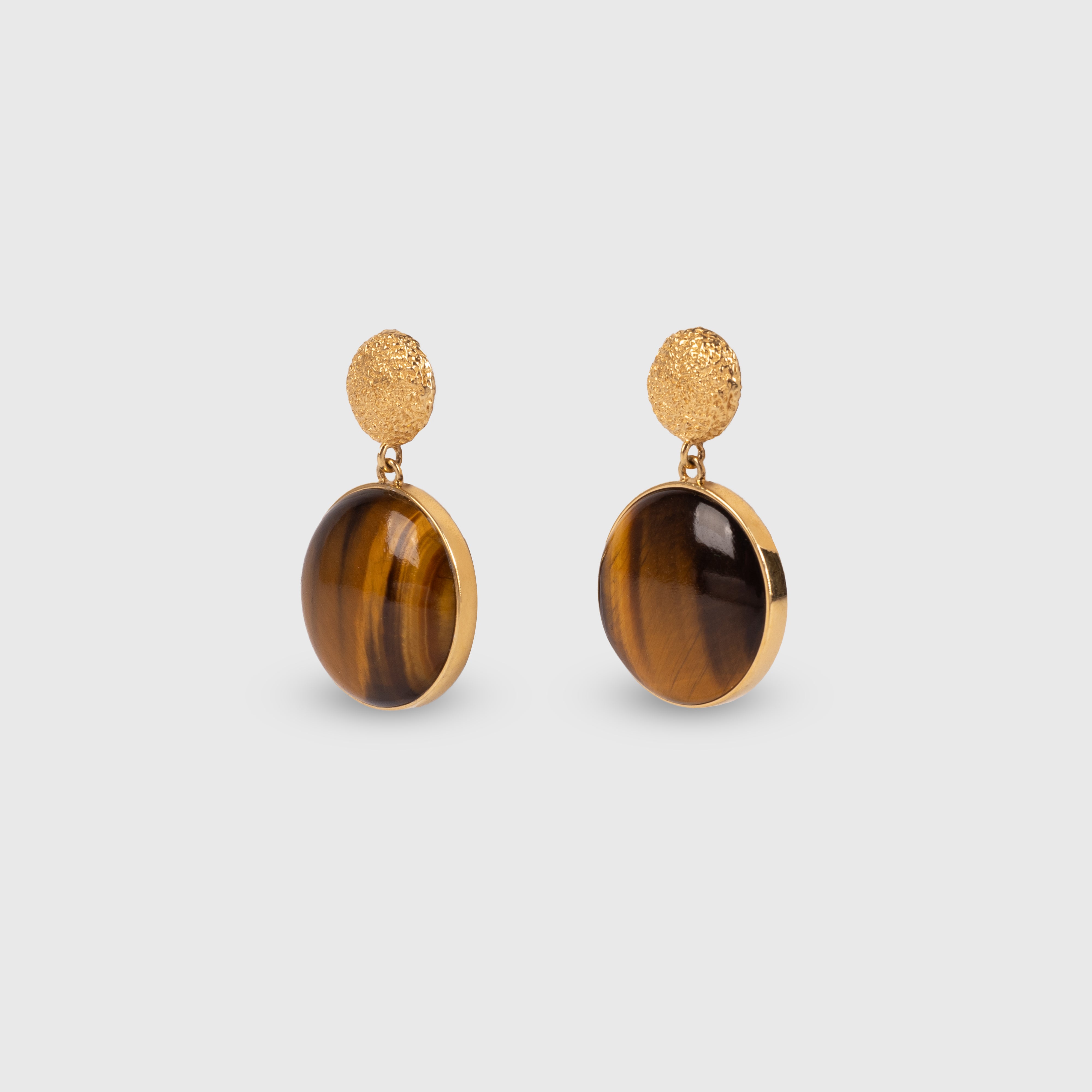 The Enchant Earrings are a bold statement piece and object of art. A Tigers Eye round cabochon with mesmerizing color patterns that change at every angle. A tribute to the fascinating visual effects of gemstones.