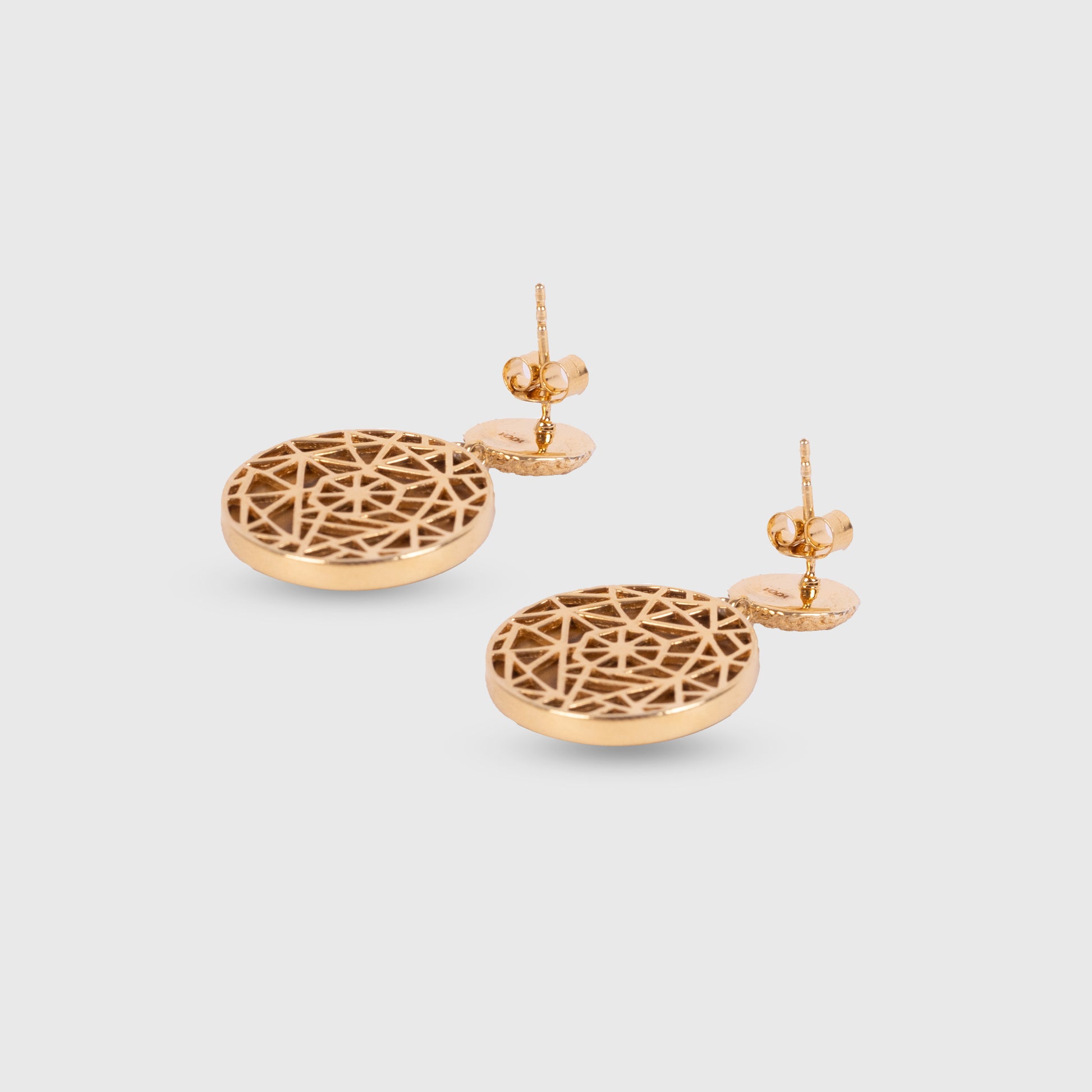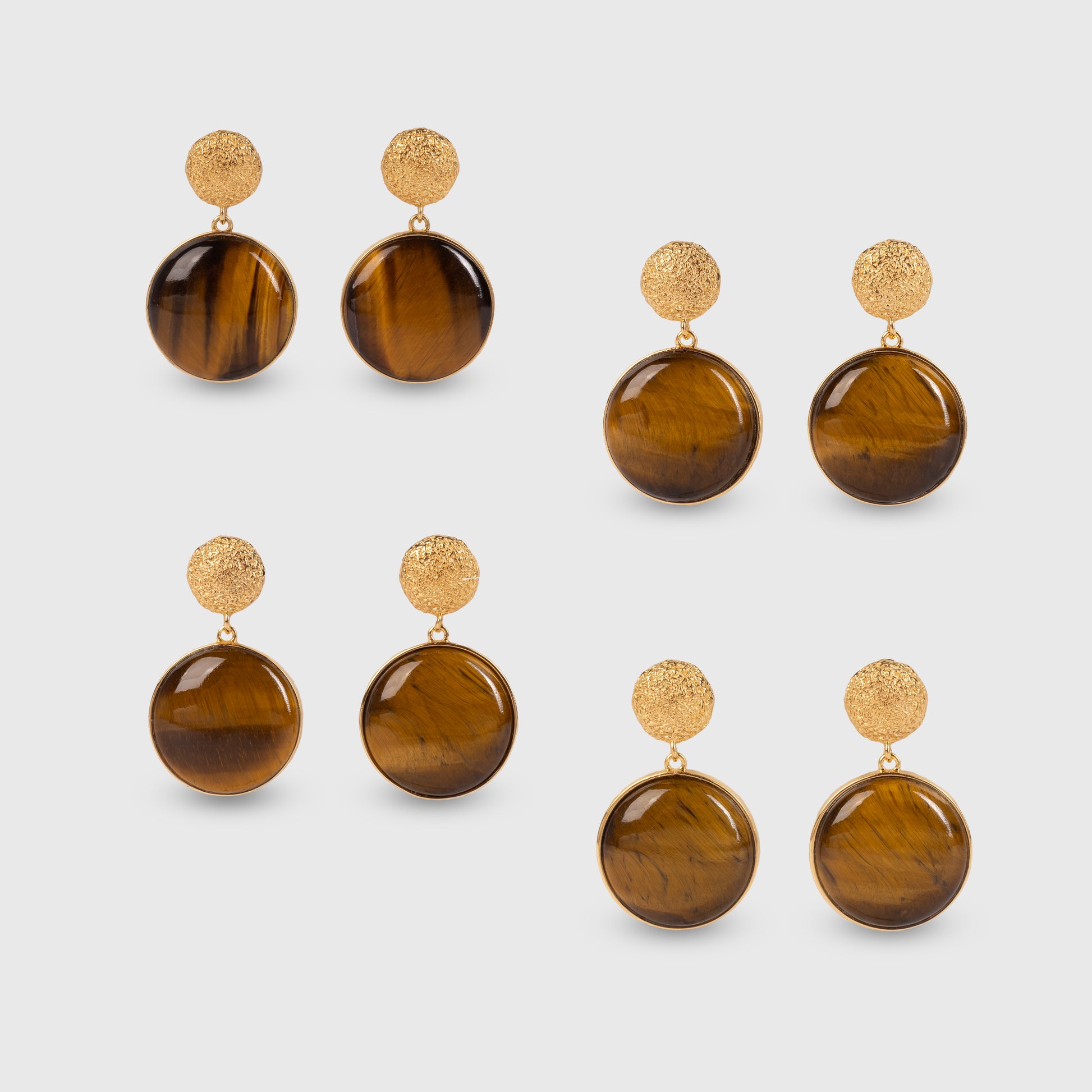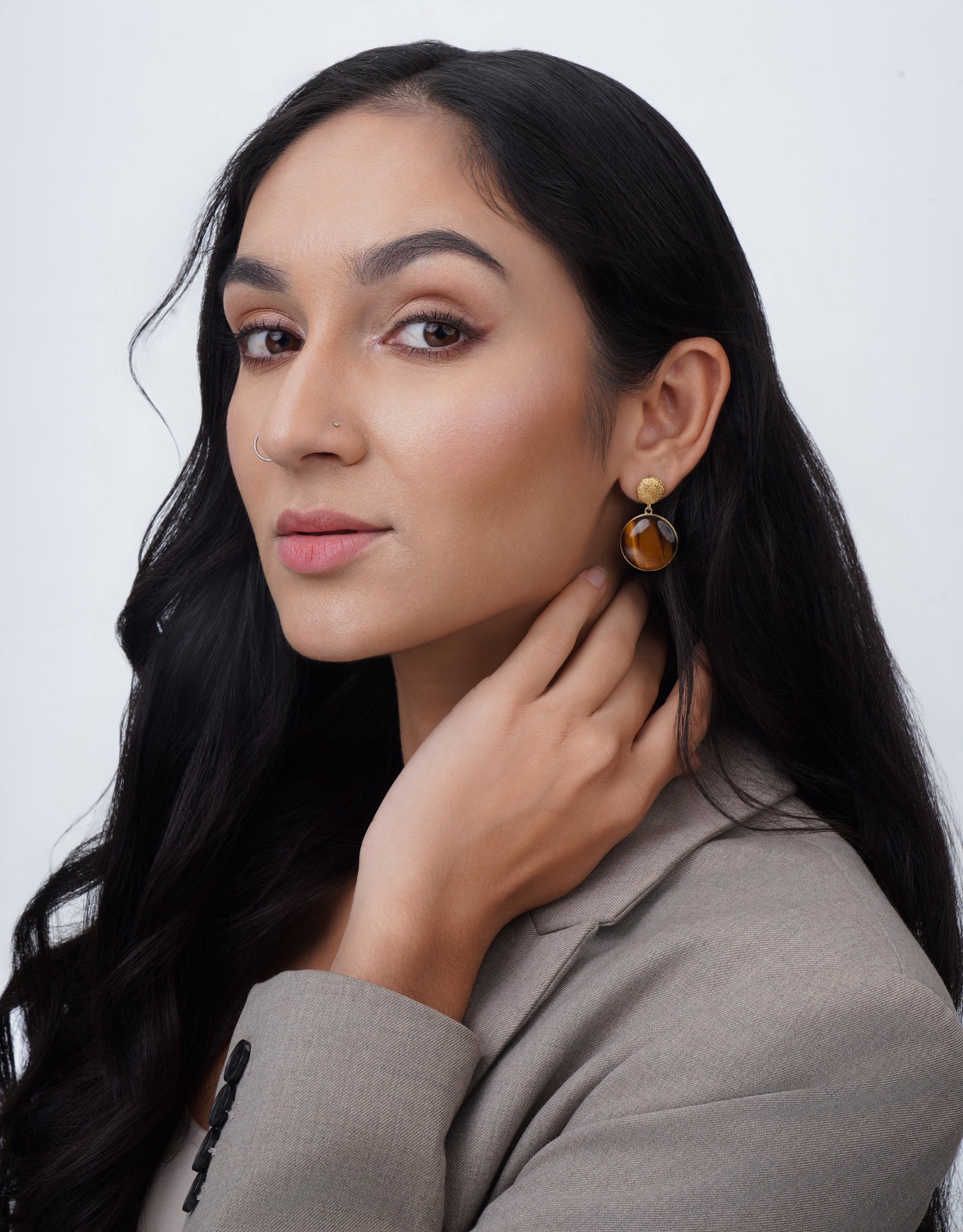 The Enchant Earrings are a bold statement piece and object of art. A Tigers Eye round cabochon with mesmerizing color patterns that change at every angle. A tribute to the fascinating visual effects of gemstones.