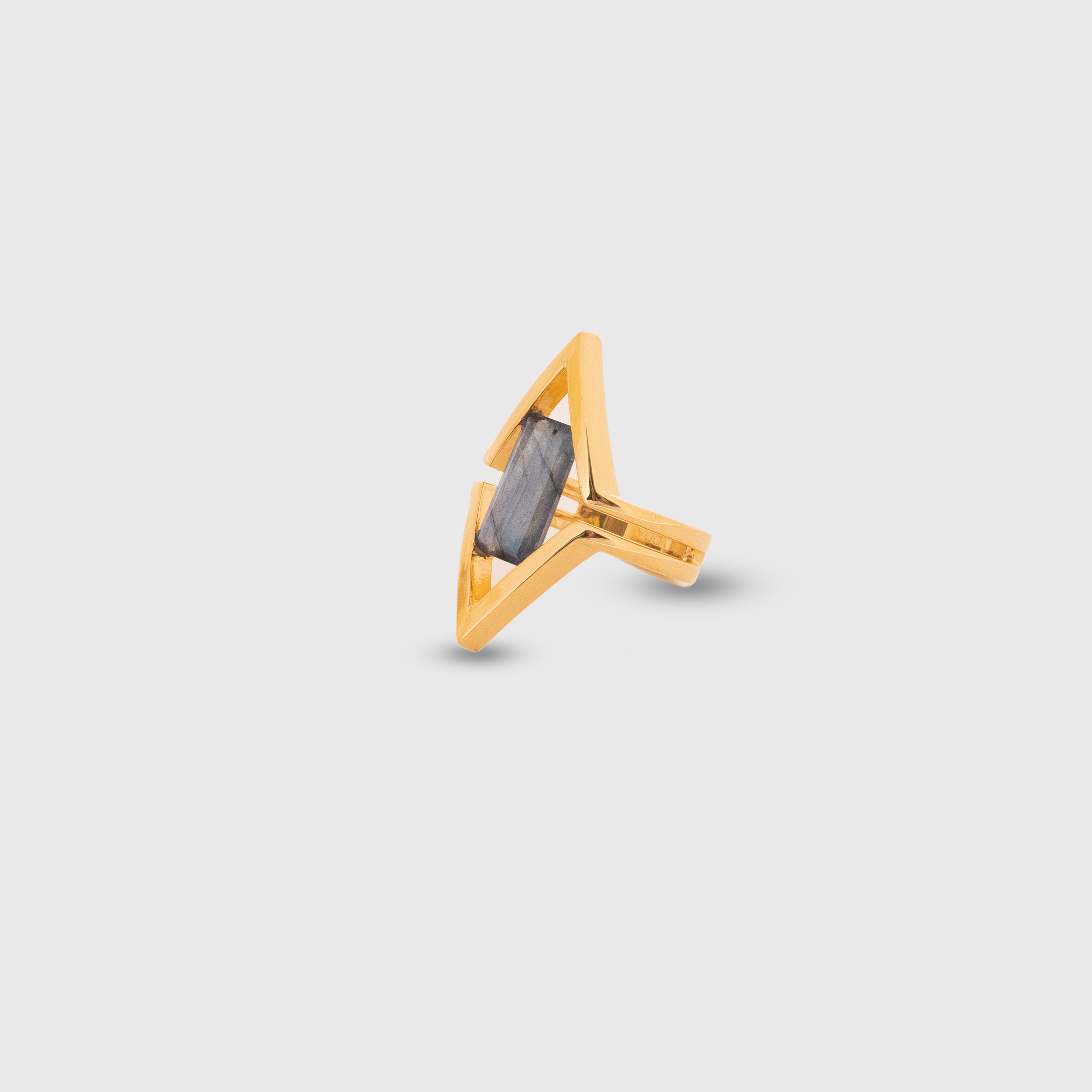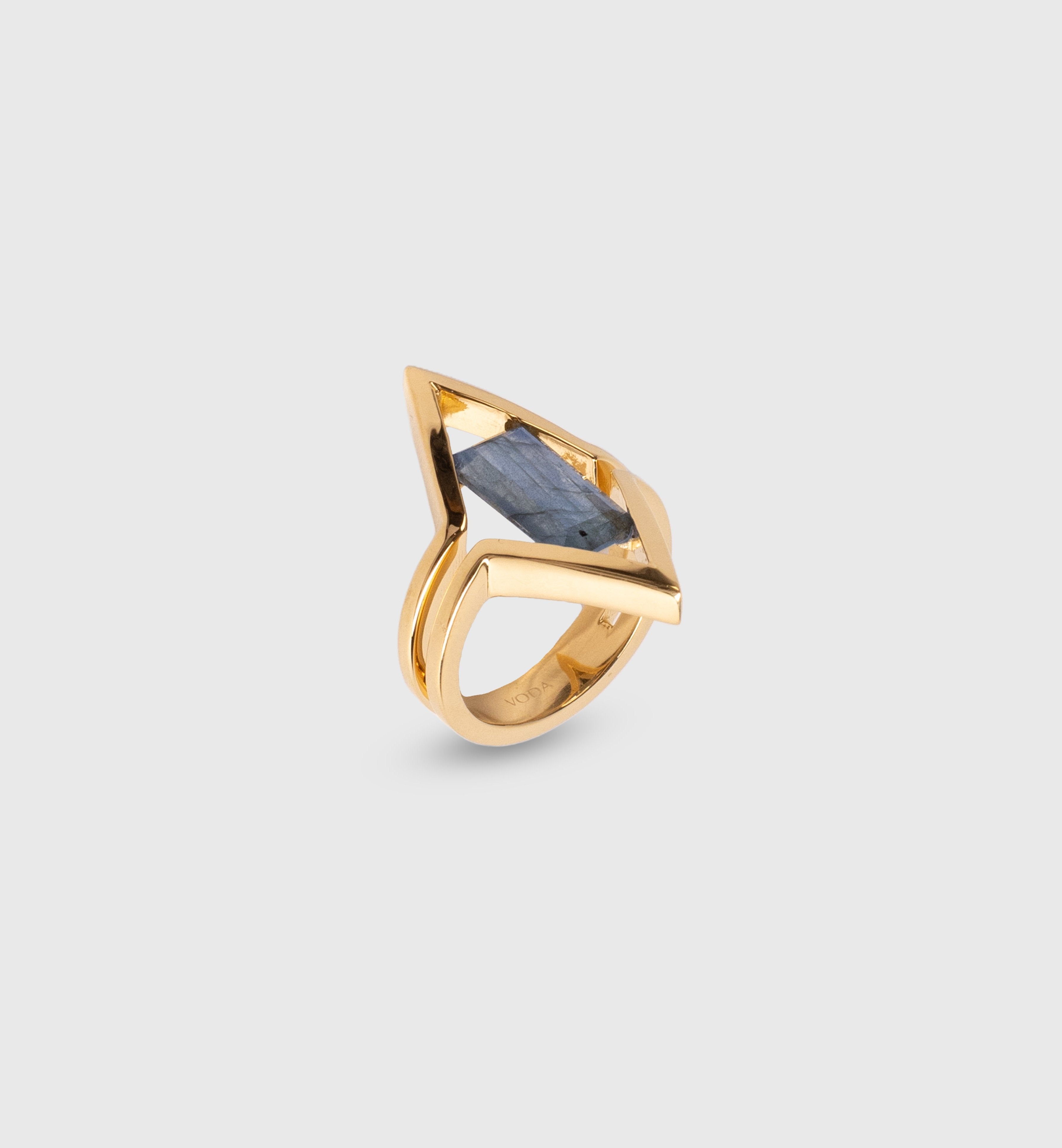 A Labradorite baguette with blue flashes constructed within a double V shape frame, V for VODA.