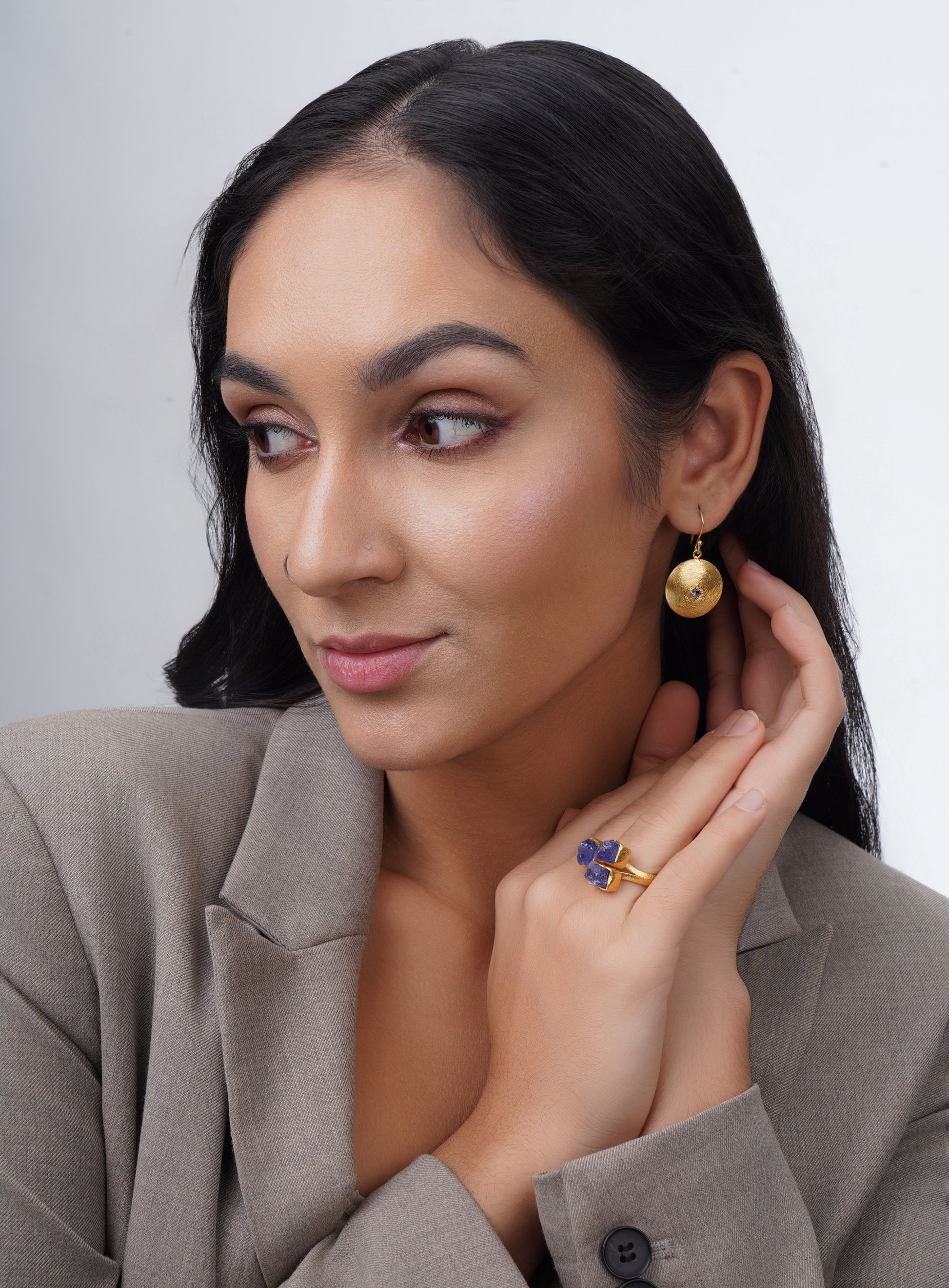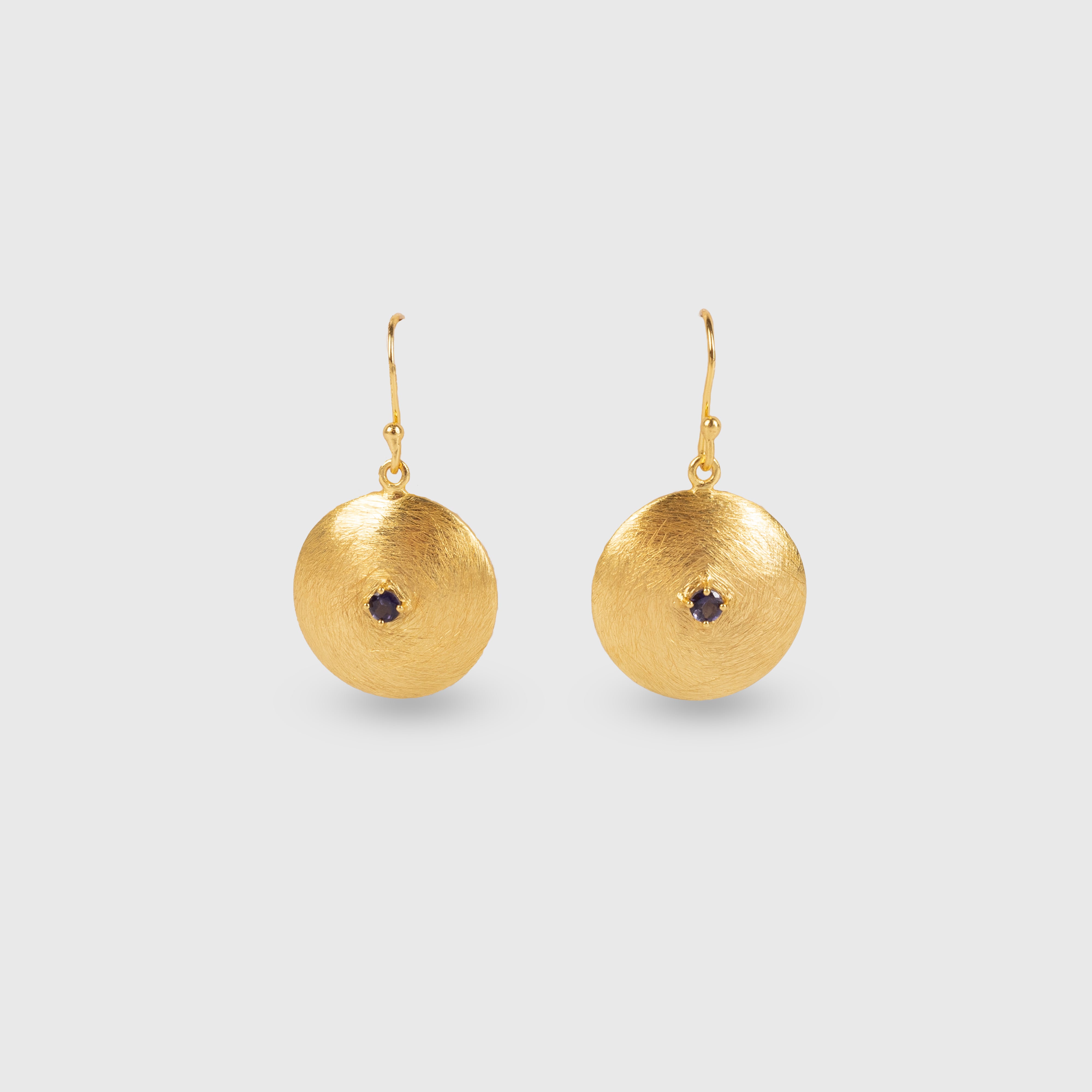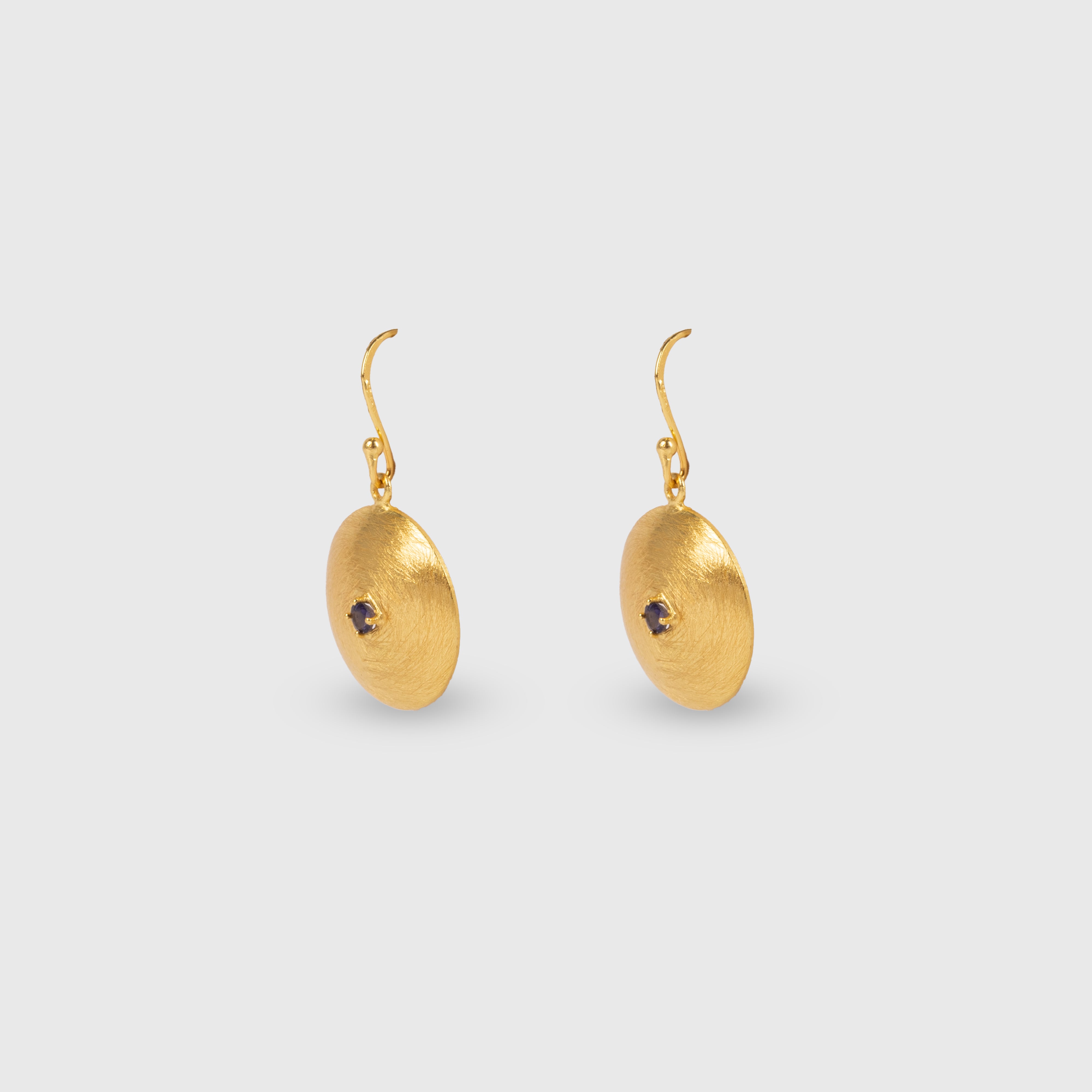 The Mesmer earrings are inspired by the crafts and architecture of the ancient Aegean World. The exquisite design features a Iolite set within a lavishly brushed gold sphere. These earrings will surely elevate your style